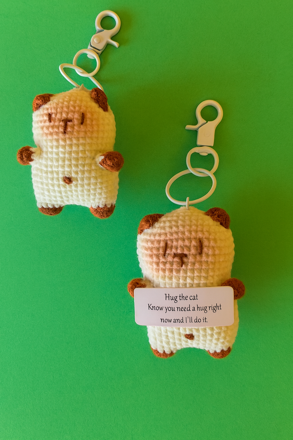 Carry a little love everywhere with this adorable Crochet Hug Cat Keyring! With its cute, hugging pose and soft yarn, this handcrafted kitty is the perfect pocket-sized companion to brighten your day and add charm to your keys or bag.
