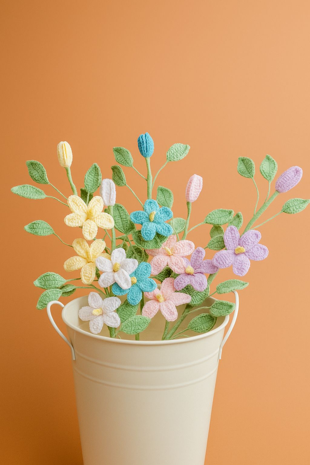 Capture the subtle beauty and sweet fragrance of the Star Jasmine with this handcrafted crochet flower. Featuring tiny star-shaped blooms and graceful greenery, this piece adds a touch of elegance and freshness to any décor or bouquet.